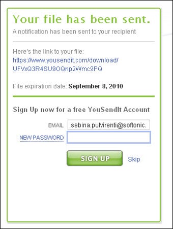 Condividere file con YouSendIt è davvero una bazzecola: si accede al sito web, si inserisce il tuo indirizzo e-mail e quello del destinatario e si carica il file da inviare. Facoltativo aggiungere un oggetto e un testo per accompagnare il file. Puoi provarlo anche senza registrarti. Il file verrà inviato via e-mail a te e al destinatario che potrà scaricarlo da uno speciale link valido 7 giorni cliccando sul pulsante di Download contenuto nell'e-mail targata YouSendIt. Niente link da copiare. Più facile di così.